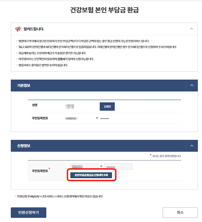 이후 본인부담금 환급금 신청내역 조회를 누르면 내가 받을 수 있는 환급금이 있다면 확인할 수 있습니다. 환급금이 있는 경우 좌측하단의 민원신청하기를 클릭해 환급금 신청을 할 수 있습니다.